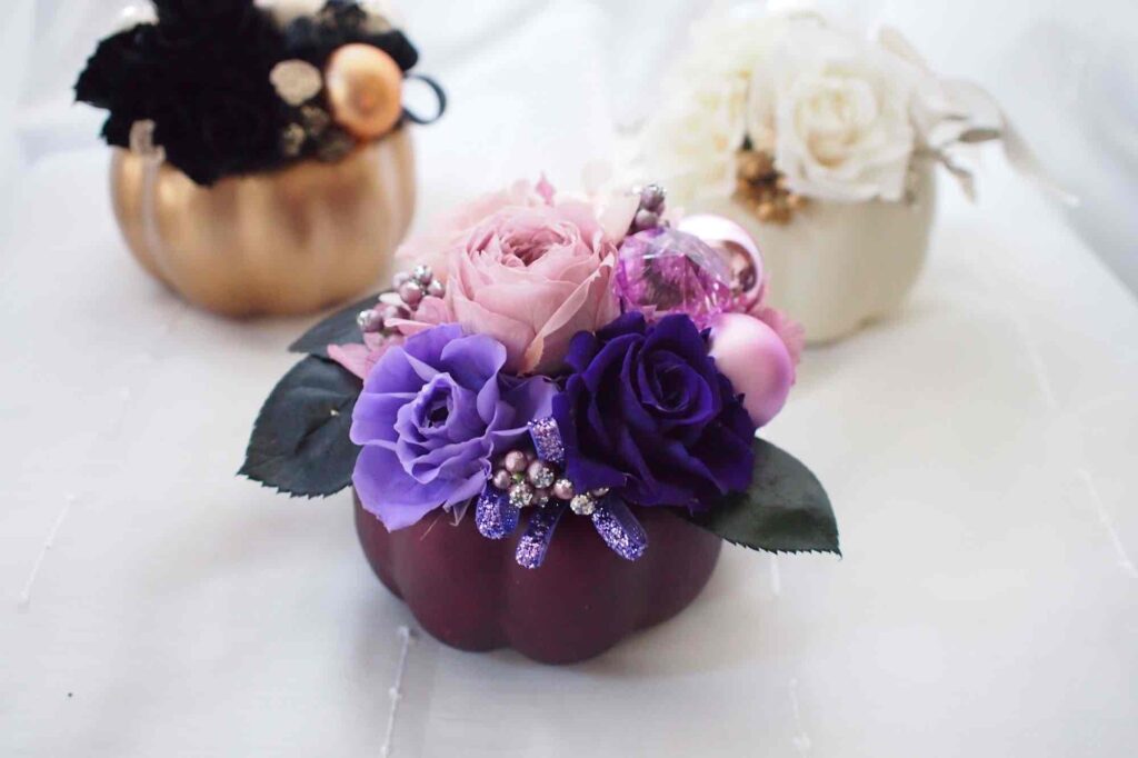 メインにはプリザーブドフラワーローズを使用し繊細な美しさが際立つよう仕上げ、さらに輝きのあるパーツを取り入れ、幻想的で乙女心をくすぐるアレンジに仕上げています。どの角度から見てもキラキラとした輝きが感じられるように工夫しました。